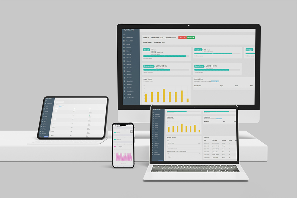 Nuestro sistema de monitoreo para grúas VORTEX IOC “Internet of cranes” ofrece una visión completa del desempeño y las condiciones de cada equipo. Esto permite anticipar riesgos, optimizar el uso y garantizar la seguridad en cada operación.